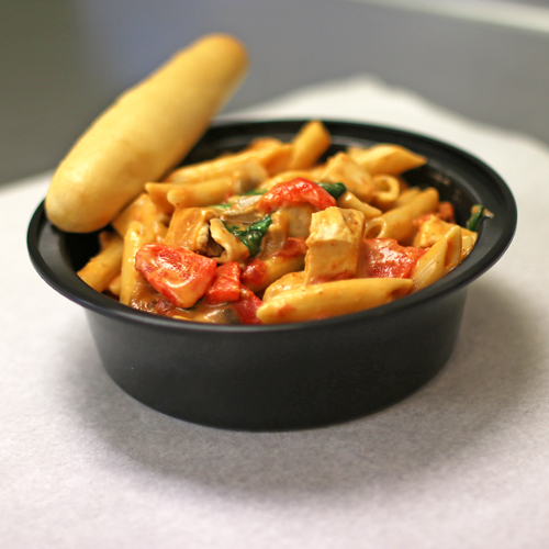 Penne pasta tossed in a spicy tomato cream sauce, with roasted red peppers, mushrooms, and crumbled Italian sausage